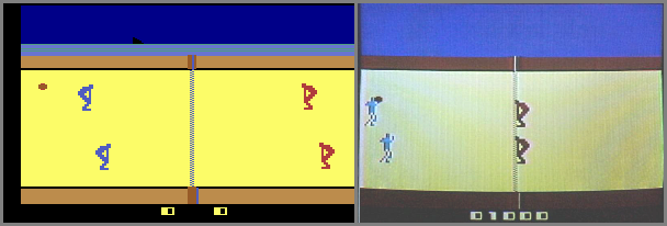 • BUG: The manual states the game ends when the first team to score 15 and win by at least 2 points, but play will stop when one team reaches 20 points whether or not they’re ahead by 2 points. {Scott Stilphen}
