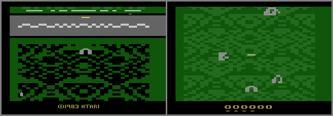 • (Prototype version 8-2-83) If played through a Cuttle Cart (with the ‘transmit empty pages’ option off), 2 additional ground targets (buildings) will appear (picture #2)! The graphics for these and more are actually present in the 8-2-83 version, but due to the nature of being a bank-switched game, the code to trigger them doesn’t work. {Scott Stilphen}
