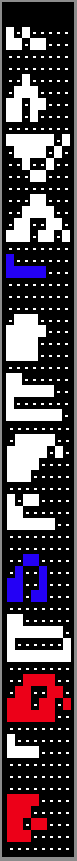 • (Prototype version 8-2-83) Besides the 2 buildings that can appear with the method above, there are graphics for possibly several other ground objects. Picture #3 shows the 2 frames of animation for the one common object (in blue), the 2 new buildings (in red), and the unknown objects (in white).