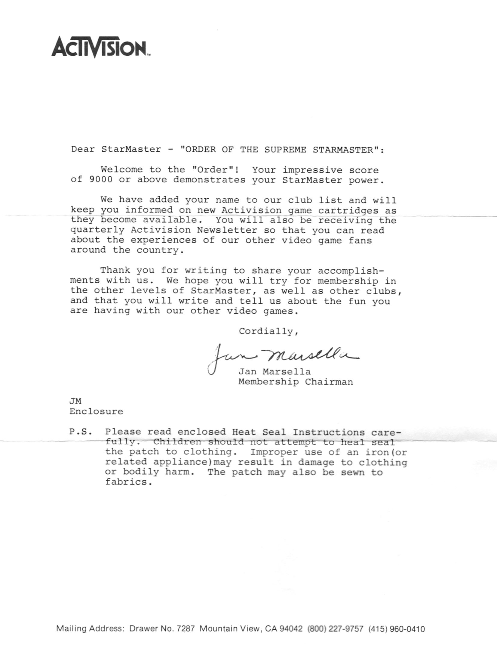 The patch requirements for some 5200 versions (Beamrider, Decathlon, H.E.R.O., Pitfall II) also required you to include $1 along with your photo, to cover shipping and handling. Yes, Activision was already being that frugal. What's worse is, some 5200 carts (such as Beamrider) shipped in VCS version boxes with a 5200 sticker on them, and others (like Keystone Kapers) came with instructions for the ColecoVision version, and it wasn't even a real manual but just a single (photocopied?) sheet of paper! Activision stopped offering patches in 1984 with their last two releases - Zenji and Zone Ranger.